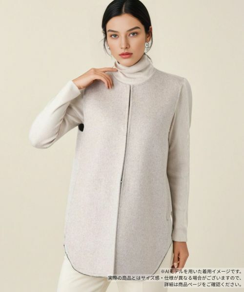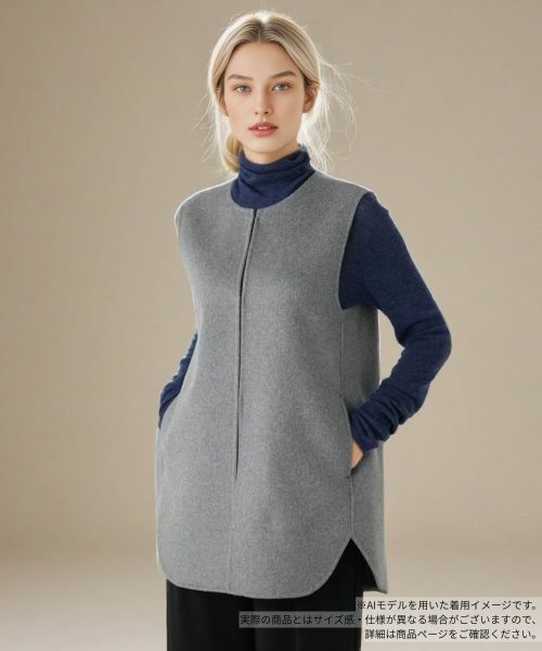 裏地のない軽やかな着心地ながら、これからの季節のコーディネートに上品な温もりをプラスするノーカラーのシンプルなベスト。フロントは鍵ホック開閉で、すっきりとしたシルエットが特徴。ヒップまでナチュラルに隠れる程度の丈感で品のある女性らしさを演出。両サイドのポケット付きで実用性も申し分なし。厚手で暖かく、タートルやニットと合わせてレイヤードスタイルを楽しめるアイテムです。------------------------------------着用シーズン:冬 伸縮性:なし透け感:なしポケット:あり生地の厚さ:厚手裏地:なし-------------------------------------※商品の色味は、撮影場所や光のあたり具合、お客様のお使いの機器により色味が違って見える場合がございます。予めご了承ください。家庭洗濯不可漂白不可タンブル乾燥不可アイロン低温120℃まで石油系溶剤ドライクリーニング弱ウェットクリーニング不可