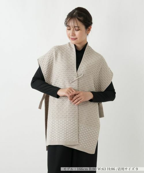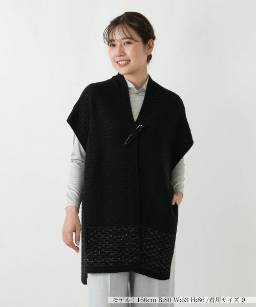 繊細なラメ糸を編み込んだ、立体的な幾何学柄が特徴のニットベスト。ポンチョのようにも羽織れるゆったりとしたシルエットが優雅なドレープを生み出します。フロントは取り外し可能なピンで留める仕様となっており、サイドのベルトでシルエットのアレンジも可能。伸縮性のあるやや厚手のニット地が着こなしに暖かさをプラスします。シンプルなタートルネックやワンピースに重ねるだけで、洗練されたレイヤードスタイルが完成します。
