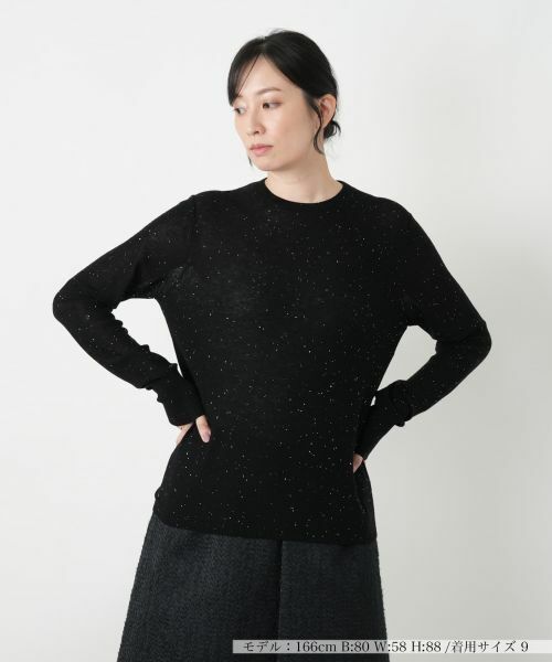 繊細なスパンコール糸を編み込み、上品な輝きをプラスしたクルーネックニットプルオーバー。伸縮性のあるやや薄手のニットでごわつくことなく、快適な着心地を実現します。ベーシックなシルエットは着回し力が高く、ジャケットやコートのインナーとしても活躍。いつものコーディネートにさりげない華やかさを添える、大人のための一枚です。------------------------------------着用シーズン:冬 伸縮性:あり透け感:なしポケット:なし生地の厚さ:やや薄手裏地:なし-------------------------------------※商品の色味は、撮影場所や光のあたり具合、お客様のお使いの機器により色味が違って見える場合がございます。予めご了承ください。家庭洗濯不可漂白不可タンブル乾燥不可アイロン不可石油系溶剤ドライクリーニング弱ウェットクリーニング不可