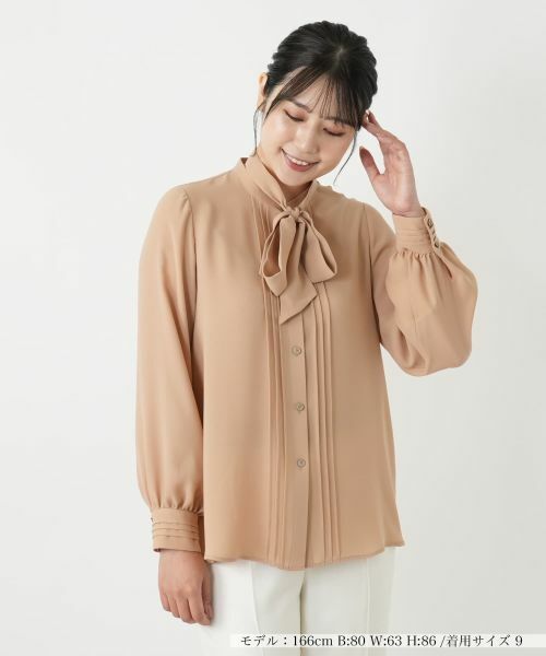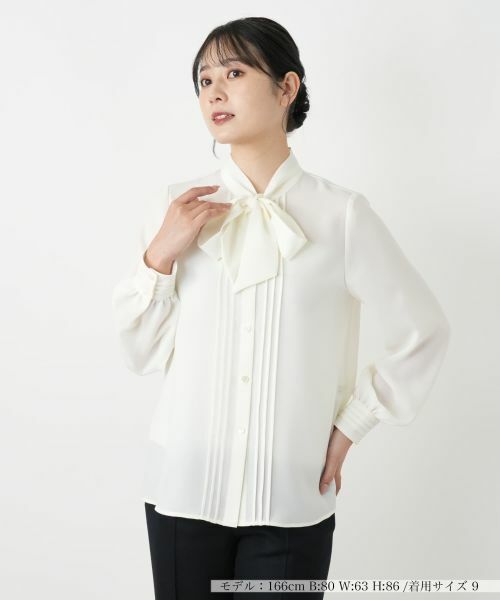 フロントにあしらわれた端正なピンタックが、クラシカルで上品な印象を与えるボウタイブラウス。付属のタイは取り外し可能で、華やかなボウタイスタイル、シンプルなスタンドカラースタイルと、気分やシーンに合わせて2WAYの着こなしが楽しめます。袖口のボリュームスリーブも女性らしさを引き立てるポイント。一枚で着映えするのはもちろん、ジャケットのインナーとしても活躍し、オンオフ問わず着回せるエレガントな一枚です。