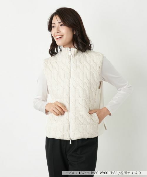 前身頃の立体的なケーブル編みと、すっきりとした後身頃の切り替えデザインが特徴的なハイネックベストです。前身頃のニット部分には繊細なラメ糸が織り込まれ、上品な華やかさをプラス。フロントは着こなしのアレンジが楽しめるダブルジップ仕様となっています。裏地付きのやや厚手なニット地で、秋冬シーズンのレイヤードスタイルに最適。裾のサイドスリットが軽やかな抜け感を演出し、便利なポケットも備えています。いつものスタイルに重ねるだけで、お洒落の幅が広がる一着です。------------------------------------着用シーズン:秋冬伸縮性:なし透け感:なしポケット:あり生地の厚さ:やや厚手裏地:あり-------------------------------------※商品の色味は、撮影場所や光のあたり具合、お客様のお使いの機器により色味が違って見える場合がございます。予めご了承ください。家庭洗濯不可漂白不可タンブル乾燥不可アイロン不可石油系溶剤ドライクリーニング弱ウェットクリーニング不可