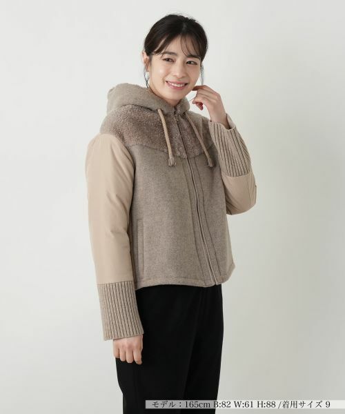 袖、フード周りのボア、そして身頃と、異素材を大胆にドッキングさせたデザインコンシャスなフーデッドジャケット。羽織るだけでコーディネートの主役になる、遊び心あふれる一着です。暖かな中わた入りで厚手の生地を用い、さらに裏地もしっかりと施されており、冬の本格的な寒さから身を守ります。フードは一体型のデザインで、ドローコードを絞ることで顔周りのフィット感を調節可能。便利なポケットも備えており、フロントはジップアップ仕様で着脱もスムーズ。