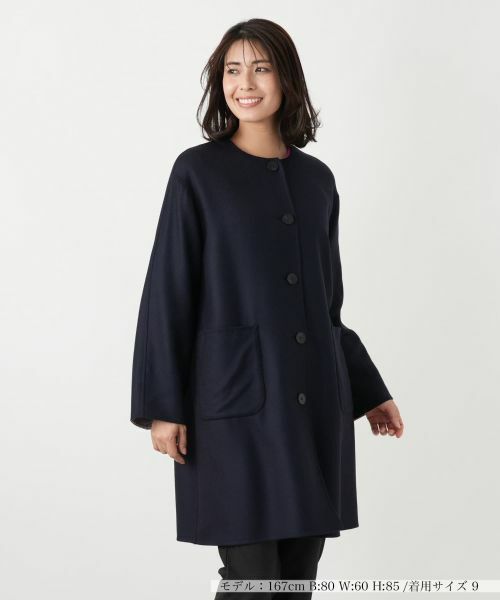 一枚で二つの表情を楽しめる、リバーシブル仕様のノーカラーコート。片面はシックな無地、もう片面はコーディネートの主役にふさわしい細やかなハウンドトゥースチェック柄を採用し、気分やスタイルに合わせて着こなしをアレンジできます。首元はすっきりとした印象のノーカラーとなっており、レイヤードスタイルにも便利なやや薄手の仕立てで軽やかに羽織れます。裏地のない一重仕立てがその軽快さを後押しし、さっと羽織るだけで様になる汎用性の高いアウターです。
