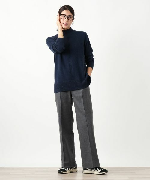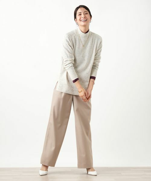 上質なカシミヤを使用した、暖かく柔らかな肌触りのハイネックニットです。全体にネップがちりばめられ、ナチュラルで表情豊かなアクセントに。センターラインと袖口に施された編み地が、シンプルなデザインにさりげないディテールを加えています。ニット地は冬のレイヤードにも使いやすいやや薄手の仕立てで伸縮性にも優れており、快適な着心地が感じられます。裾にはスリットが入っており、絶妙な抜け感を演出。様々なボトムスとバランス良く合わせられる一枚です。