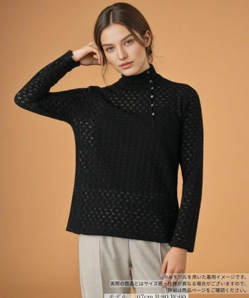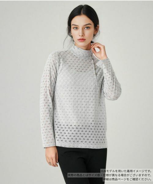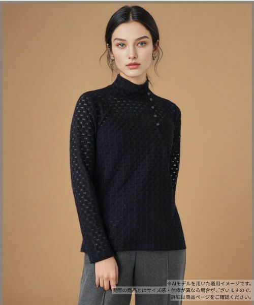 繊細な透かし編みが、エレガントな表情を演出するハイネックニットソーです。首元はリズミカルなループボタン開閉仕様で、クラシカルなアクセントを加えています。冬のレイヤードにも使いやすいやや薄手の仕立てで伸縮性を備えているため、快適な着心地を実感できます。袖口にはスリットが入っており、手元にさりげない抜け感をプラス。ジャケットやカーディガンのインナーとして、コーディネートを上品に格上げする一枚です。