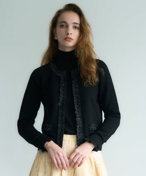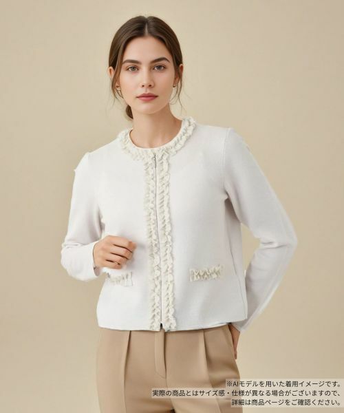 ネックラインから前立てにあしらわれたフリルが華やかな印象を与える、ジップアップ仕様のニットカーディガンです。フリル部分にはラメチュールを使用し、さらにビーズを施すことで上品な煌めきをプラス。冬のレイヤードにも使いやすいやや薄手の仕立てで伸縮性もあり、ジャケットのようなきちんと感とニットの快適な着心地を両立しています。羽織りとしてはもちろん、ジップを閉じてプルオーバー風に着こなすのもおすすめです。------------------------------------着用シーズン:冬伸縮性:あり透け感:色によりありポケット:なし生地の厚さ:やや薄手裏地:なし-------------------------------------※商品の色味は、撮影場所や光のあたり具合、お客様のお使いの機器により色味が違って見える場合がございます。予めご了承ください。家庭洗濯不可漂白不可タンブル乾燥不可アイロン低温120℃まで石油系溶剤ドライクリーニング弱ウェットクリーニング不可