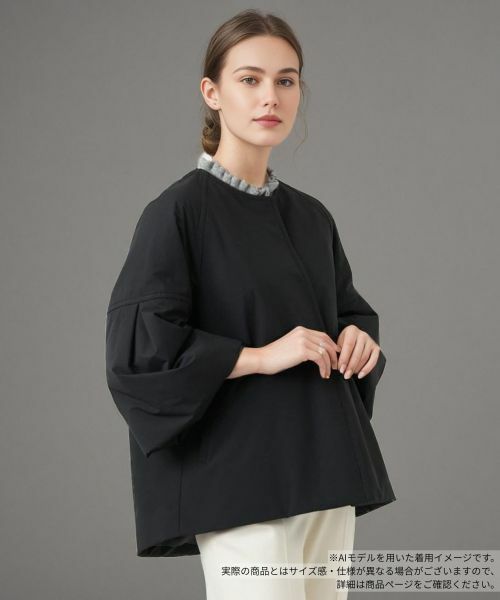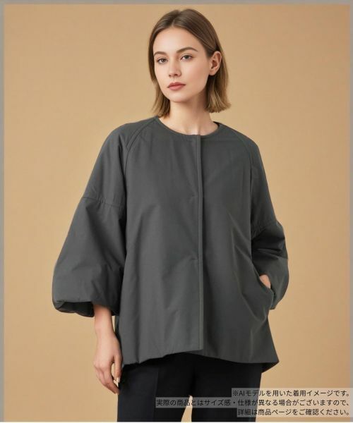 ゆったりと広がるトレンドライクなボリュームスリーブが、大人フェミニンな印象を与えるノーカラーコート。手首が覗く七分袖が、重くなりがちな冬の装いに軽やかな抜け感をプラスします。フロントはスナップボタン仕様ですっきりと仕上げており、マフラーやタートルネックとも好相性。厚手のニットの上からも羽織りやすく、裏地付きで保温性も十分。アームウォーマーやグローブとのコーディネートも映える、主役級のアウターです。