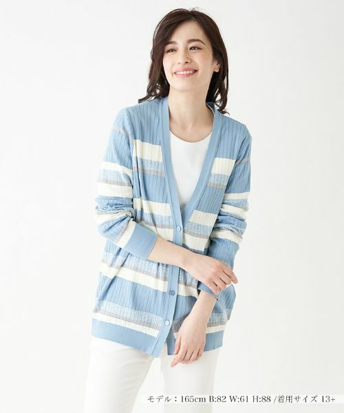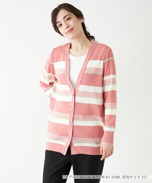 コーディネートのアクセントにもちょうどいいマルチボーダーのVネックカーディガン。ラメラインを入れることで華やかさをプラスしました。リブ仕立てになっているからすっきりと着こなせるのも◎。