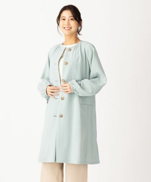 衿ぐり・袖にギャザーワーク、リラックス感のあるシルエットのスプリングコート。とても軽い素材感が特長です。中空糸※を使用しているポリエステル素材は合繊の機能性を持ちながらも、天然繊維のような風合いです。※中空糸:中心部分が空洞で筒形の形状をした糸のこと。通常の糸よりも軽量化されています。※定価(税込)は、2022年06月29日のセール開始前の店舗における販売価格です。家庭洗濯不可漂白不可タンブル乾燥不可アイロン低温120℃までドライクリーニング可ウェットクリーニング不可