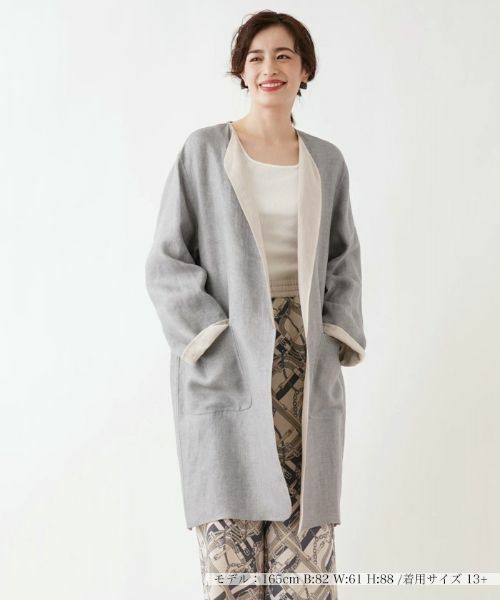 キレイめにもカジュアルにも合わせやすいシンプルなルックスで、着回しに活躍するバイカラーコート。表と裏を配色で仕上げたこだわりのデザインが、さりげないオシャレを感じさせます。麻をベースとした軽やかな着心地は季節の変わり目にぴったり。
