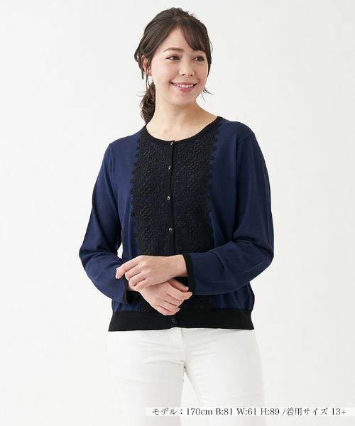 フロントに配した繊細なレース使いが美しいハイゲージニットカーディガン。袖口やヘムのリブ配色を切替えた、メリハリのあるデザインも魅力的。細身のシルエットだから、1枚で着こなすのにも最適です。※定価(税込)は、2022年06月29日のセール開始前の店舗における販売価格です。家庭洗濯不可漂白不可タンブル乾燥不可アイロン低温160℃まで石油系溶剤ドライクリーニング弱ウェットクリーニング不可