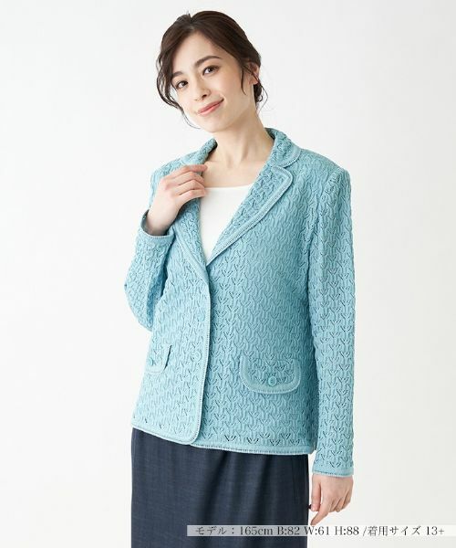 まるでレースのような透かし編み模様が美しいデザインのニットジャケット。コットン100%に仕上げたさらりとした風合いが春夏らしいデザインです。ダークトーンのワンピースなど、シンプルなアイテムの合わせにもピッタリです。※定価(税込)は、2022年06月29日のセール開始前の店舗における販売価格です。家庭洗濯不可漂白不可タンブル乾燥不可アイロン低温160℃まで石油系溶剤ドライクリーニング弱ウェットクリーニング不可