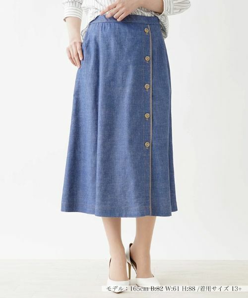 生地を切り替えて細かいディティールにこだわったデザイン性の高いデニムスカート。脚がキレイに見える丈感と、立体的で程よいハリ感のある美しいシルエットで、デニム生地ながらもきちんと感のあるルックス。トップスで変化をつければ、オフィスシーンにもデイリーユースにも使える着回し力の高いアイテムです。