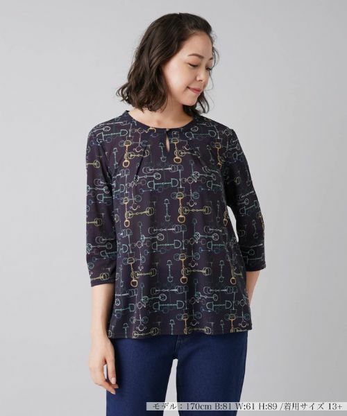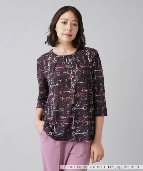 配色を効かせたビットモチーフを縦横ランダムにプリントしたインパクトのあるトップス。胸元にドロップホールをデザインし、ヌケ感をプラスしました。華奢な手首を強調する7分袖がコーディネートに軽やかさを与えます。