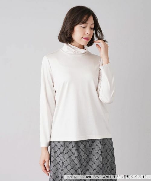 大人の女性らしいスタイリッシュな着こなしが楽しめるハイネックカットソー。心地よくフィットする細身のシルエットで、ドレープ感のあるネックがやわらかなニュアンスを生み出します。生地はシルクにストレッチ素材を混紡しており、肌当たりがよく滑らかな表面感で着心地も快適。薄手なのでジャケットやコートのインナー使いにもオススメです。
