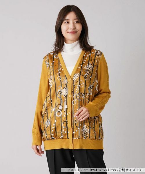 すっきりとした印象でスタイリングできるVネックカーディガン。チェーン×ストライプ柄のスクリーン染料プリントを施した、光沢感のあるサテン生地でフロント部分を切り替えています。上品なカラーでまとめているから派手になりすぎることなく、シンプルなニットやカットソーに重ねるだけで、上級者らしい技アリのコーディネートが楽しめるアイテムです。