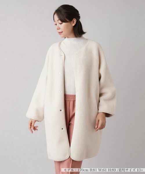 ふっくらとしたボア素材を使用した、リラックスシルエットのノーカラーコート。アウトラインはフェイクレザーによるパイピングで程よく引き締めています。フロントはスナップボタン仕様でスムーズに着脱可能。優しい着心地でありながら暖かさもきちんと確保できるアイテムは、これからの季節のお出掛けには欠かせない存在になりそうです。落ち着きのあるカラーで大人っぽさも抜かりなく取り入れられます。