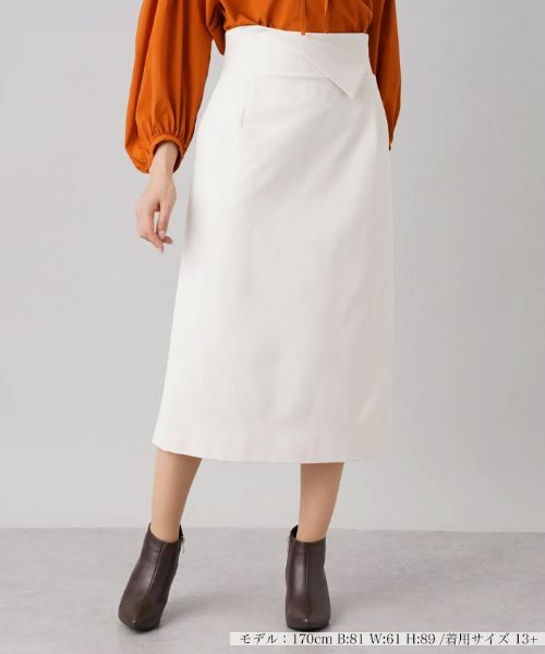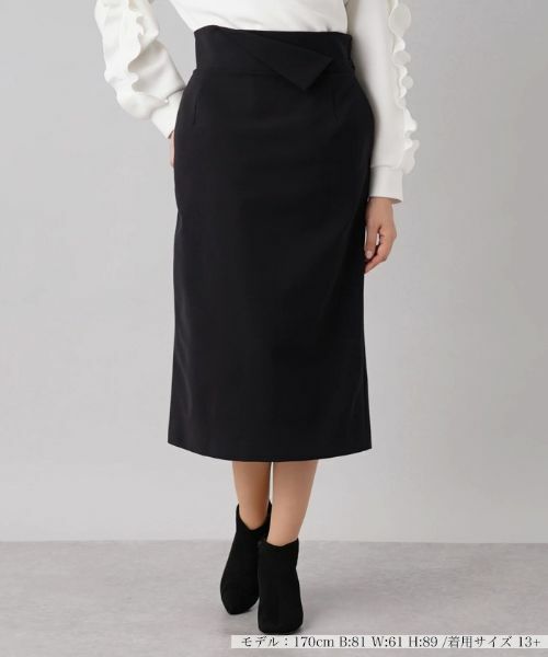 ウエスト部分のアシンメトリーな折り返しが、さりげなくスタイリッシュなアクセントになったロング丈のタイトスカート。サイドファスナーで着脱しやすいのも嬉しいポイント。後ろの裾にはスリットが入っているので、タイトシルエットでも歩きやすいデザインに。コーディネート力に優れたベーシックなカラーを揃えているから、オフィスなどのデイリーにもオフの日のお出かけにも大活躍。ウエストデザインが特徴のスカートなので、トップスはインして着るのがおすすめです。