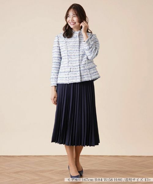 彩り豊かなツイード生地で仕立てたスタンドカラージャケット。心地よく寄り添うすっきりとしたシルエットなので、コンパクトな印象で着こなせます。フロントはクルミスナップボタン仕様で着脱しやすいデザインに。ウエスト両サイドには小さめのフラップポケットをバランスよくレイアウトしています。合わせるパンツ、スカートを選ばずコーディネートの幅が広がりそうな一着です。