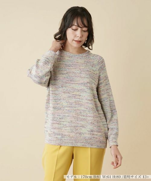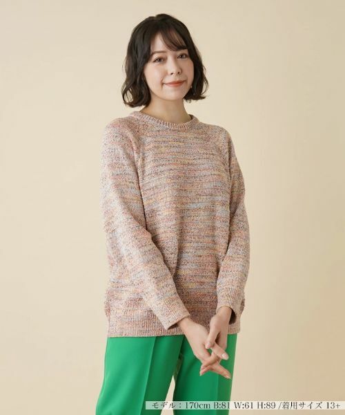 春らしい明るいトーンのミックスカラーで仕上げたクルーネックニットプルオーバー。ボーダー状の編み模様が身頃を飾り、美しいアクセントに。コットン100%を使用した心地よいぬくもりとさらりとした肌触りが特徴。袖はラグランスリーブで肩肘張らないストレスフリーの着心地を叶えました。スタンダードな丈感でボトムスともコーディネートしやすく、着回し力の高いトップスとなっています。