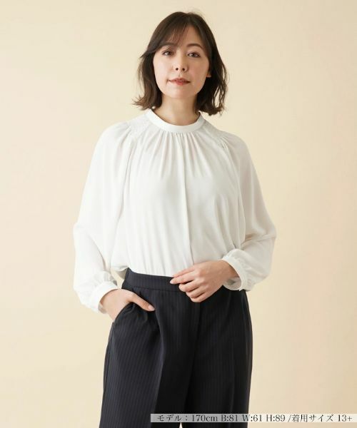 ネックラインから広がるギャザーシルエットが柔らかなニュアンスを生み出す、スタンドカラーのオーバーブラウス。バックボタン仕様で意外性をもたせており、後ろ上部のみ実際にボタン開閉が可能です。ふんわりとした袖はラグランカットで肩肘張らないリラックス感のある着心地を叶えました。落ち着いたシックなカラーでスカートにもパンツにもコーディネートしやすい一枚です。