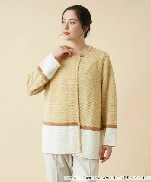 3色の切り替えでメリハリたっぷりに仕上げた、新鮮なデザインのカーディガン。ネックに貝調ボタンをあしらい、開放感のあるリラックスシルエットを作り出しています。肌当たりのよい軽やかな素材感はこれからの季節のスタイルにぴったり。ヒップまで隠れる程度の丈感で自然と体型カバーも叶えてくれそうです。