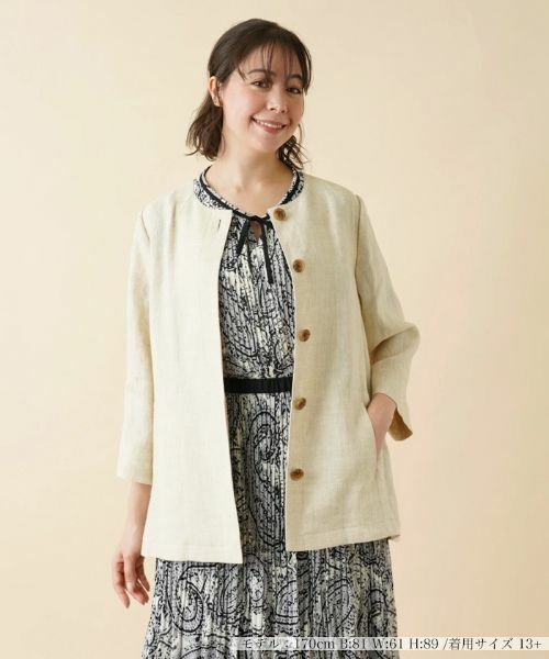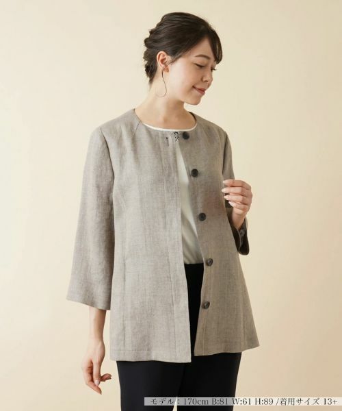 麻100%を使用したナチュラルな風合いがこれからの季節にぴったりなノーカラージャケット。フロントは比翼仕立てですっきりとした印象でデザインしました。大きめのボタンをあしらった、コーディネートを軽やかに盛り上げてくれる一着です。ヒップまで隠れるゆとりのあるシルエットでライトアウターとして活躍してくれるアイテムです。