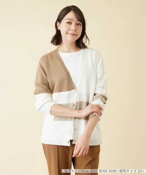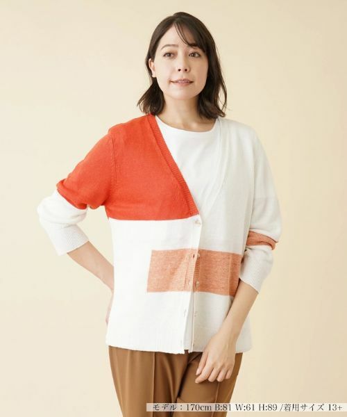 麻を丁寧に編み込んださらりとした風合いのVネックカーディガン。計算されたカラーブロックデザインがさりげなく個性を引き立て、新鮮な印象のスタイリングを演出。シャープなネックラインが絶妙なバランスの抜け感を作り出しています。ボトムスを選ばずに合わせやすく、これからの季節のコーディネートの主役として活躍してくれそうな一枚。