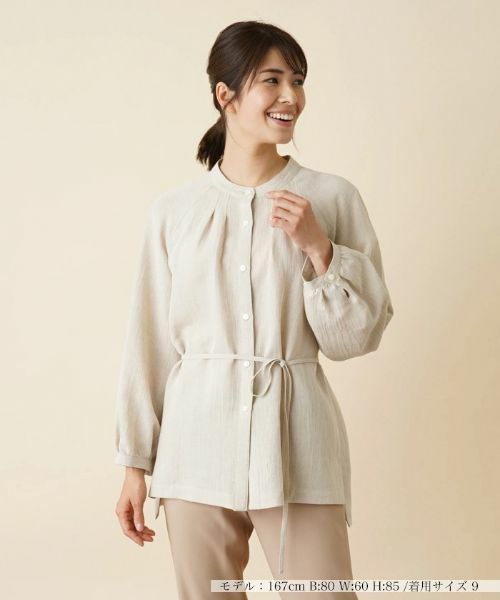 リネンにコットンをブレンドしたほんのりシアーな風合いの生地で仕立てた、シーズンらしいストライプ柄のブラウス。バンドカラーのフロントにはタックをあしらい、立体感のあるシルエットを生み出しています。ロング丈のアイテムも細いリボンベルトをウエストマークすれば、メリハリの効いたスタイルに。裾にはサイドスリットを入れ、絶妙な抜け感を作り出しています。