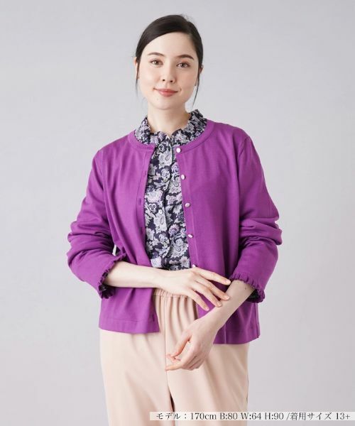 ジャストサイズの細身シルエットで仕上げた、ミニマルなデザインのクルーネックニットカーディガン。ネックラインは浅めに設定し、落ち着いた上品な佇まいを演出。袖口にはフリルを施し、ほんのり華やかな雰囲気を作り出しています。フロントにきらりと輝くメタルボタンもさりげないアクセントに。ボタンの開閉により着こなしのアレンジも楽しめます。