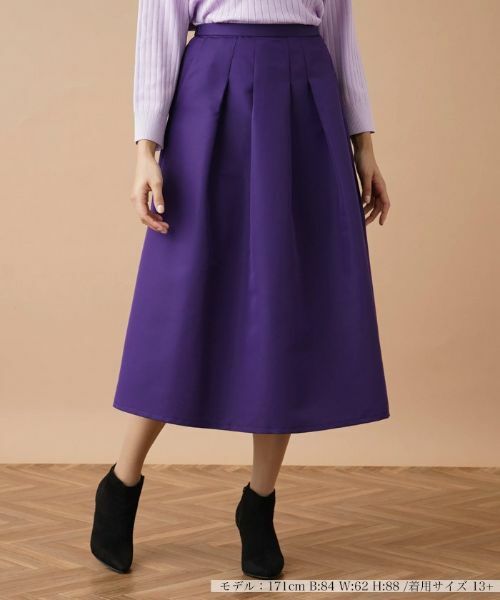 オリジナルのパープルカラーに染め上げたタックスカート。細番手のポリエステルを高密度に織り上げた、上品な風合いのグログラン組織で程よい肉感とハリ感が特徴。ゆったりとワイドに広がるAラインシルエットがフェミニンムードを演出。バックウエストをゴム仕様としているので、きれい見えしながらも楽な穿き心地を実感できます。タックインすればスタイルアップ効果も狙えそうです。サイドはホック&ファスナーにより開閉が可能。