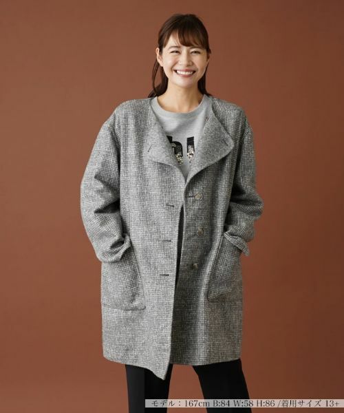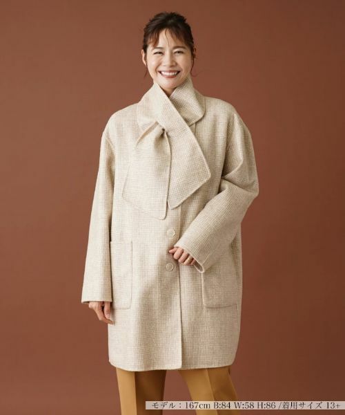 ハウンドトゥース柄とメランジ調のリバーシブルで着用できる、厚手のアルパカ混生地を使用したノーカラーコート。同素材のティペットがセットになっており、お好みに応じてアレンジして楽しめます。ドロップショルダーでシルエットに程よいリラックス感をもたせており、肩肘張らないストレスフリーの着心地を実現しています。フロントにマーブルボタンを採用し、細部までこだわりを感じさせるデザインに。オンオフを選ばず多彩なシーンで活躍するアウターです。
