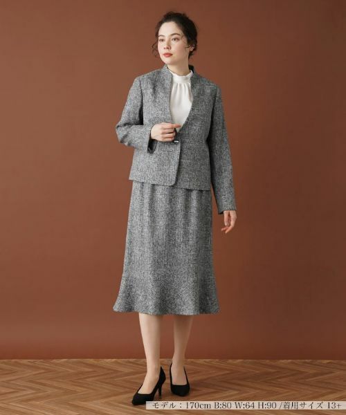 やや薄手のツイード生地で仕立てた味わい深い表情のスーツ。スタンドカラーと深めのネックラインが絶妙なバランスの抜け感を作り出します。スリット入りの袖口は折り返してのアレンジも可能。スカートはマーメイドシルエットでヘムラインをフリリーに仕上げ、ほんのり甘く華やかなニュアンスに。ハイウエストで穿けるので脚長見せのスタイルアップ効果も狙えそうです。スカートはサイドホック&ファスナーにより開閉が可能。------------------------------------着用シーズン:秋伸縮性:なし透け感:なしポケット:ジャケット:あり、スカート:なし生地の厚さ:やや薄手裏地:ありウエスト:伸縮性なしあり-------------------------------------※商品の色味は、撮影場所や光のあたり具合、お客様のお使いの機器により色味が違って見える場合がございます。予めご了承ください。