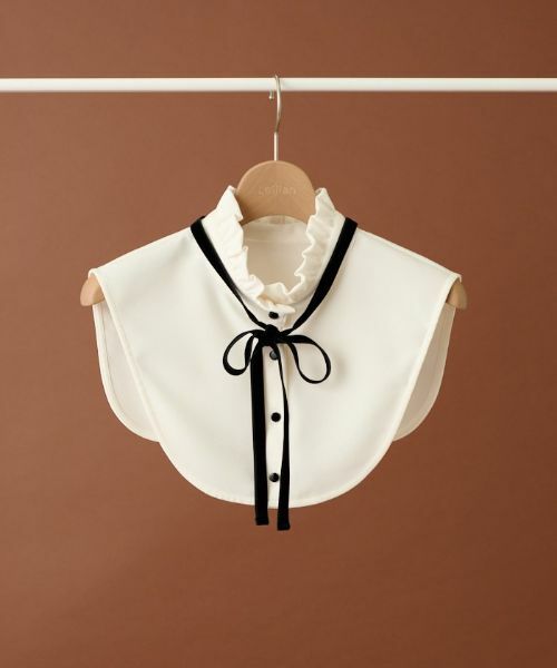 襟元のフリルがフェミニンな印象の付け襟。リボンに合わせた黒色のボタンが付いています。光沢のある起毛素材のリボンは取り外し可能なので、シンプルに襟だけでもご使用いただけます。ボタンは身頃の色に合わせた白色の替えボタン付きです。ご家庭でお洗濯可能です。手洗い可酸素系漂白可タンブル乾燥不可つり干し(日陰)アイロン低温120℃までドライクリーニング可ウェットクリーニング(弱い処理)