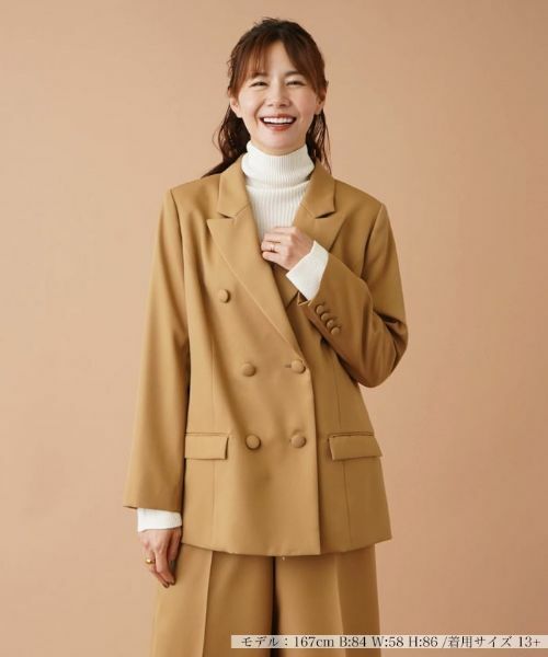 シャープなピークドラペルやくるみボタンを留めたダブルブレストのフロントがエレガントなムード漂わせるブレザー。ほんのり光沢を放つ上品な生地の風合いも相俟って、大人レディな着こなしを演出します。ベーシックな無地なので、合わせるインナーやボトムスとの組み合わせも自由自在。ビジネスからパーティまで多彩なシーンで活躍してくれそうなアイテムです。