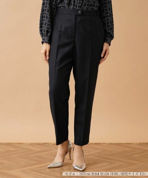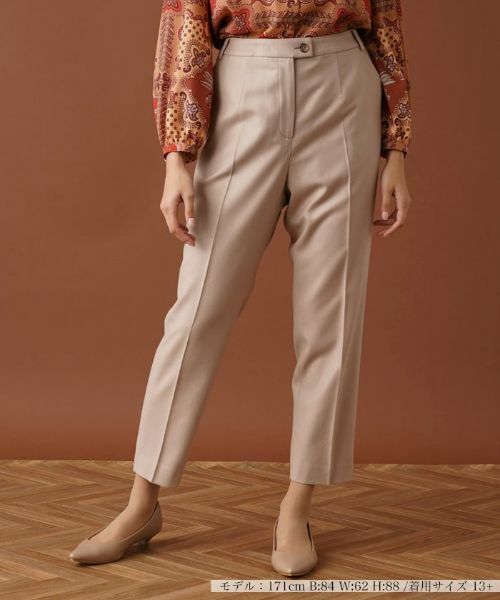 やや細身のテーパードシルエットが美脚スタイルを演出してくれる、センタープレス入りのアンクルパンツ。無駄な装飾を省いたシンプルなデザインでトレンドに左右されることなく活躍します。カジュアルにもきれいめにもコーディネートできるボトムスは、大人のワードローブにマストな存在です。ボタン&ホック、ファスナーにより着脱が可能。