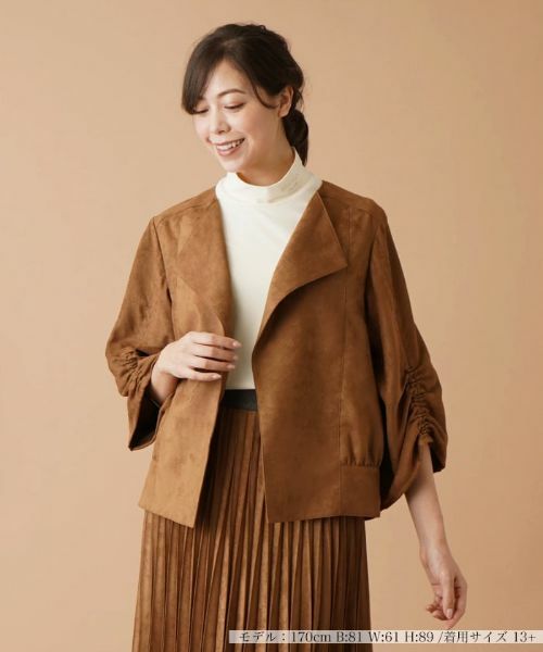 しなやかな風合いとストレッチ性を併せ持つ、秋冬らしいフェイクスエード素材を使用したジャケット。存在感のあるメンズライクなラペルやボリューム感溢れるパッカリングスリーブがインパクトを放ち、着こなしのアクセントに。お手持ちのインナーやブラウスを重ねるだけで、ひと味違ったレイヤードスタイルが楽しめるアウターです。