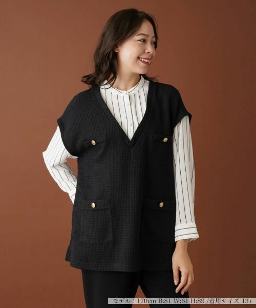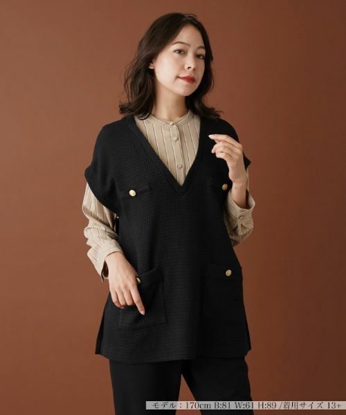バンドカラーブラウスに表情のあるツィーディーなVネックベストを重ね着したようなレイヤードデザインのトップス。これだけで大人フェミニンな旬のスタイリングが完成します。ブラウス部分のストライプやベスト部分のポケット縁にあしらったゴールドボタンがお洒落なエッセンスに。ゆったりめのシルエットなので、すっきりとしたパンツでまとめると好バランスのコーディネートに仕上がります。