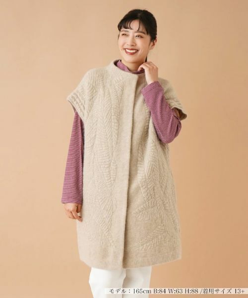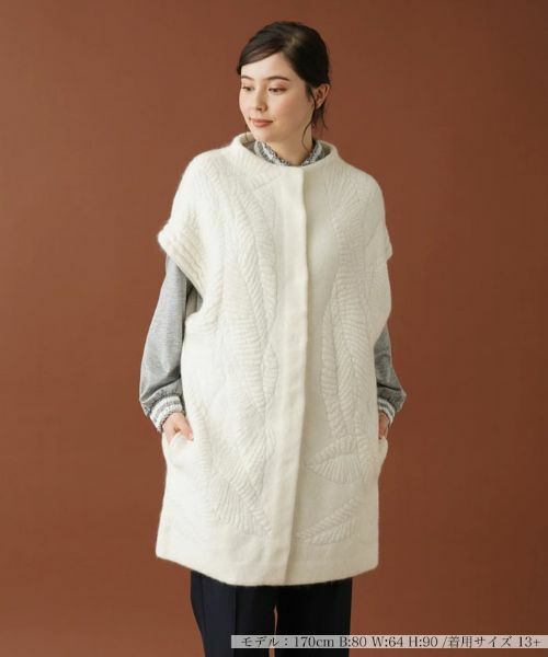 レリーフを思わせるボタニカル調の模様が浮かぶロングニットベスト。モヘヤをブレンドしたニットの優しい温もりが感じられるアイテムで、お手持ちのニットやカットソーとのレイヤードスタイルが手軽に楽しめます。大人の女性らしい上品な印象を与えるボトルネックタイプ。ショルダーラインをカバーするようなゆったりとしたシルエットでリラックス感たっぷり。フロントはスナップボタンによりスムーズに着脱が可能です。