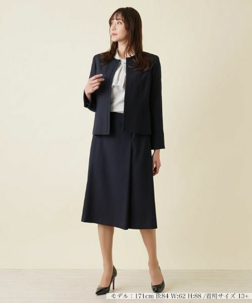 エレガントなノーカラージャケットとミディアム丈スカートのセットアップ。豊かな表面感を持つ高級感のあるジャカード生地がシンプルながらも洗練された印象を与えます。トレンドに左右されることなく、上品かつ落ち着いた雰囲気を演出する一着です。ビジネスからオケージョンまで幅広いシーンに対応し、大人のワードローブに必須のアイテムとなりそうです。スリット入りの袖口は折り返してのアレンジも行えます。ジャケットはフロントホック留め、スカートはサイドホック&ファスナーによりスムーズに着脱が可能。