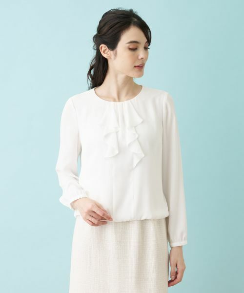 フロントネックから縦にラッフルフリルをあしらった、華やかな印象の長袖ブラウス。二重組織のため、薄手ながらも透けにくく肌触りの良い素材を使用しています。ヘムはシャーリングゴムを入れてふんわりと仕上げており、ボトムインしなくてもさまになるシルエットがポイント。バックネックの涙あきはループボタンにより開閉が可能。オフィスからセレモニーまで幅広いシーンで活躍してくれそうなトップスです。
