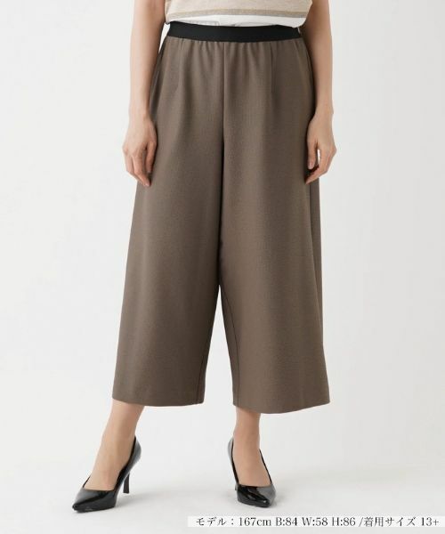軽快な印象でスタイリングできるクロップド丈のワイドパンツ。表面感のあるエンボス生地を使用した爽やかな風合いがこれからの季節にぴったり。生地には程よいストレッチ性があるのでヒップ周りが楽になり足捌きも良好。ウエストは総ゴム仕様とし、心地よいフィット感が感じられる快適なはき心地を実現しています。シンプルなカットソーはもちろん、フェミニンなブラウスやオーバーサイズシャツなど、キレイめのトップスとのコーディネートにもおすすめです。