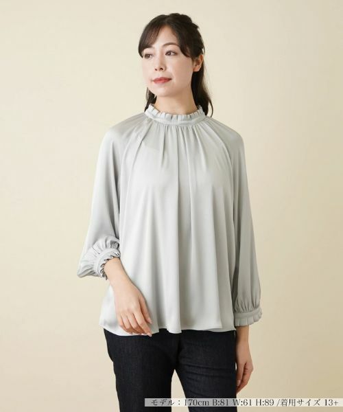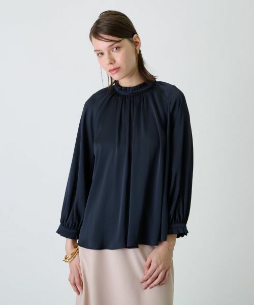 柔らかな光沢感を纏うファブリックで仕立てられた、ゆるシルエットのオーバーブラウス。スタンドカラーと袖口に施された繊細なタックが、これからの季節のコーディネートをレディライクなムードへと昇華させます。フレアスカートとのマッチングはもちろん、すっきりとしたラインのパンツともバランスよくコーディネートできる一枚。デイリーカジュアルをリュクス感たっぷりにアップデートでき、旬のフェミニンルックを後押ししてくれるアイテムです。