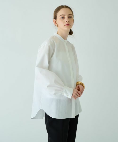 たっぷりとギャザーを施したふっくらボリュームスリーブが、旬なシルエットを描き出す長袖ブラウス。すっきり詰まったバンドカラーが顔周りを引き締めてくれるから、大人っぽく知的なムードも忘れないスタイリングが叶いそう。