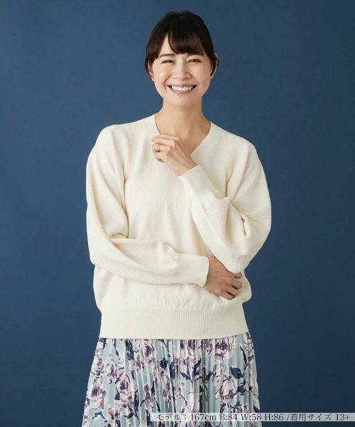 ホールガーメントのプルオーバーニット。Vネックですっきりとした印象です。表面の凹凸感と後ろ身頃に分量が出る立体的なデザインが魅力的です。吸水、速乾性に優れたコットンポリエステルのドライタッチで肌触りのいい素材を使用しています。