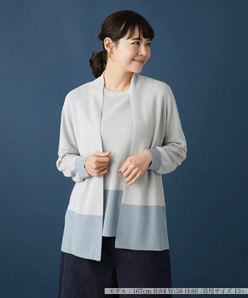 袖口や裾周りに色の変化を加えた、バイカラーのトッパーカーディガン。シンプルながらコーディネートにメリハリを演出でき、さりげなくお洒落に差をつけてくれるデザインです。やや長めの着丈となっており、フロントはノーボタンですっきりとした印象に。レーヨンにナイロンをブレンドして丁寧に編み込んだ、ニットの優しい風合いが感じられる一枚です。------------------------------------着用シーズン:初夏 伸縮性:あり透け感:ありポケット:なし生地の厚さ:やや厚手お取扱い方法:ウォッシャブル(手洗い可)-------------------------------------※商品の色味は、撮影場所や光のあたり具合、お客様のお使いの機器により色味が違って見える場合がございます。予めご了承ください。手洗い可漂白不可タンブル乾燥不可つり干し(日陰)アイロン低温160℃まで石油系溶剤ドライクリーニング弱ウェットクリーニング(弱い処理)