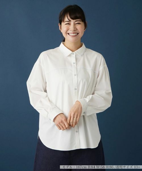 ロング丈のチュニックブラウスはレイヤードに最適なアイテム。衿、ヨーク、袖口には配色の特殊ステッチをいれたデザインで、重ね着はもちろん一枚でもすっきりと着ていただけます。クリーンな表面感のストレッチ素材を使用しているため、キックバックに優れた着心地の良いブラウスです。