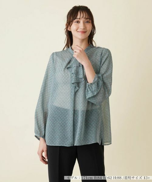 透け感のあるシフォン素材に施されたジオメトリック柄が、洗練されたレトロな魅力を放つブラウス。カジュアルなリラックスフィットでありながらも、フロントのラッフルフリルが動きに合わせて揺らめき、軽やかな大人のエレガンスを演出。ジャケットやコートのインに取り入れることで、スタイリングに絶妙なアクセントを加えることができるので、コーディネートの主役としてフレキシブルに活躍してくれそうです。