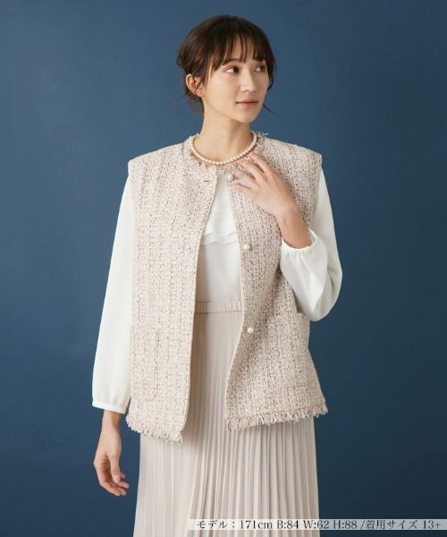 ざっくりとした表情のツイード生地で仕立てたセミロング丈のベスト。ネックやヘムラインは裁ち切りのフリンジでナチュラルな表情を作り出しています。ネック中央にはパール調ボタンをあしらい、さりげなくお洒落を後押しするディテールを取り入れました。前ウエストには小さめのポケットをバランスよくレイアウト。ニットやカットソーに重ねるだけで上級者らしいレイヤードスタイルが完成し、コーディネートの格上げにもひと役かってくれそうなアイテムです。