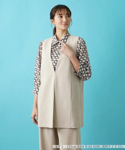 薄手でさらりとした生地を使用したノーカラーロングベスト。シンプルかつ洗練されたデザインで、様々なコーディネートに柔軟にマッチ。ノーカラーのクリーンなラインが特徴的で、着こなしの幅を広げてくれる便利なアイテムです。インナーはロゴ入りTシャツでカジュアルダウンさせたり、フェミニンなブラウスを合わせてトレンド感を演出したりとお好み次第。シーズンを通して多彩なスタイルを楽しめるアイテムです。フロントは鍵ホックにより開閉が可能。